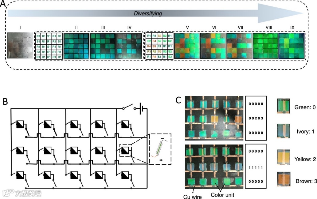 实验人员以液晶盒为基础,构建了一系列5×5液晶盒组合阵列用于展示在防伪应用方面加密手段的多样性(图4A)。实验人员还设计了外部电路(图4B)来实现对防伪系统的智能化控制,通过施加电场将液晶盒的结构颜色调整为乳白色来表示数字代码,显示了所设计系统中信息的可编程性和交互性(图4C)。