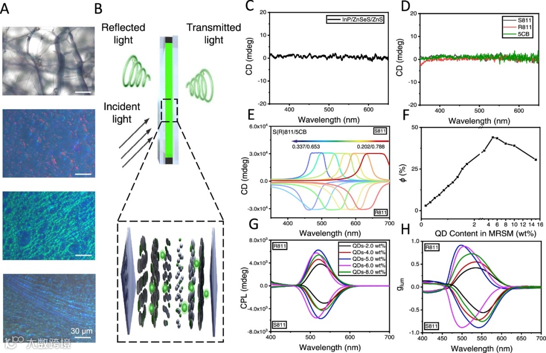Figure 2. (A)MRSM 的POM图像。(B) MRSM的手性产生。(C–E)InP/ZnSeS/ZnS QDs(C)、S/R811、5CB(D)和MRSM(E)的CD光谱。(F) MRSM的量子产率优化。(G) MRSM不同QDs含量的CPL光谱。(H) 圆偏振光不对称因子glum值。