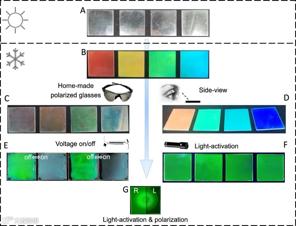 Figure 3. (A,B)封装在液晶盒中的MRSM的热致变色行为。随着温度的升高和降低,材料在无色(A)和彩色(B)之间切换。(B)中四个液晶盒的颜色由MRSM的组分重量比决定,并在低温下显现。(C)使用与MRSM手性方向相反的偏振眼镜观察到的颜色变化。(D)从45°侧视观察,所有液晶盒的结构色都出现了蓝移。(E)结构色随着施加电压的开启和关闭而变为乳白色并恢复。(F)在紫外光的激发下,所有材料都发射明亮绿光。(G)在光激发与偏振片共同作用下,材料出现亮度差异。