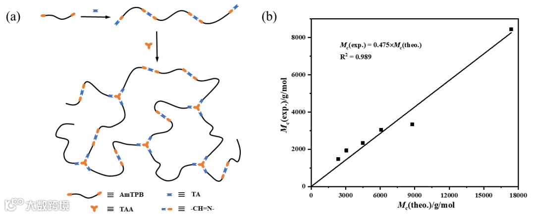 图1. 可逆交联橡胶的制备路线(a);Mc(exp.)和Mc(theo.)的关系图(b)