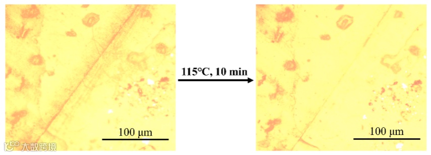 由于具有可逆交联的性质,该橡胶还具有重加工和自修复的特性。将样品剪碎后于115 ℃下热压,可重新得到一块没有缺陷的薄膜,力学性能表征显示样品重加工三次后其力学性能基本不变。另外,在一块完整的样品表面用刀片划出一道裂缝,再将其放在115 ℃的热台下加热10 min,显微镜下可明显看到裂缝逐渐变小,表明样品具备一定的自修复能力。