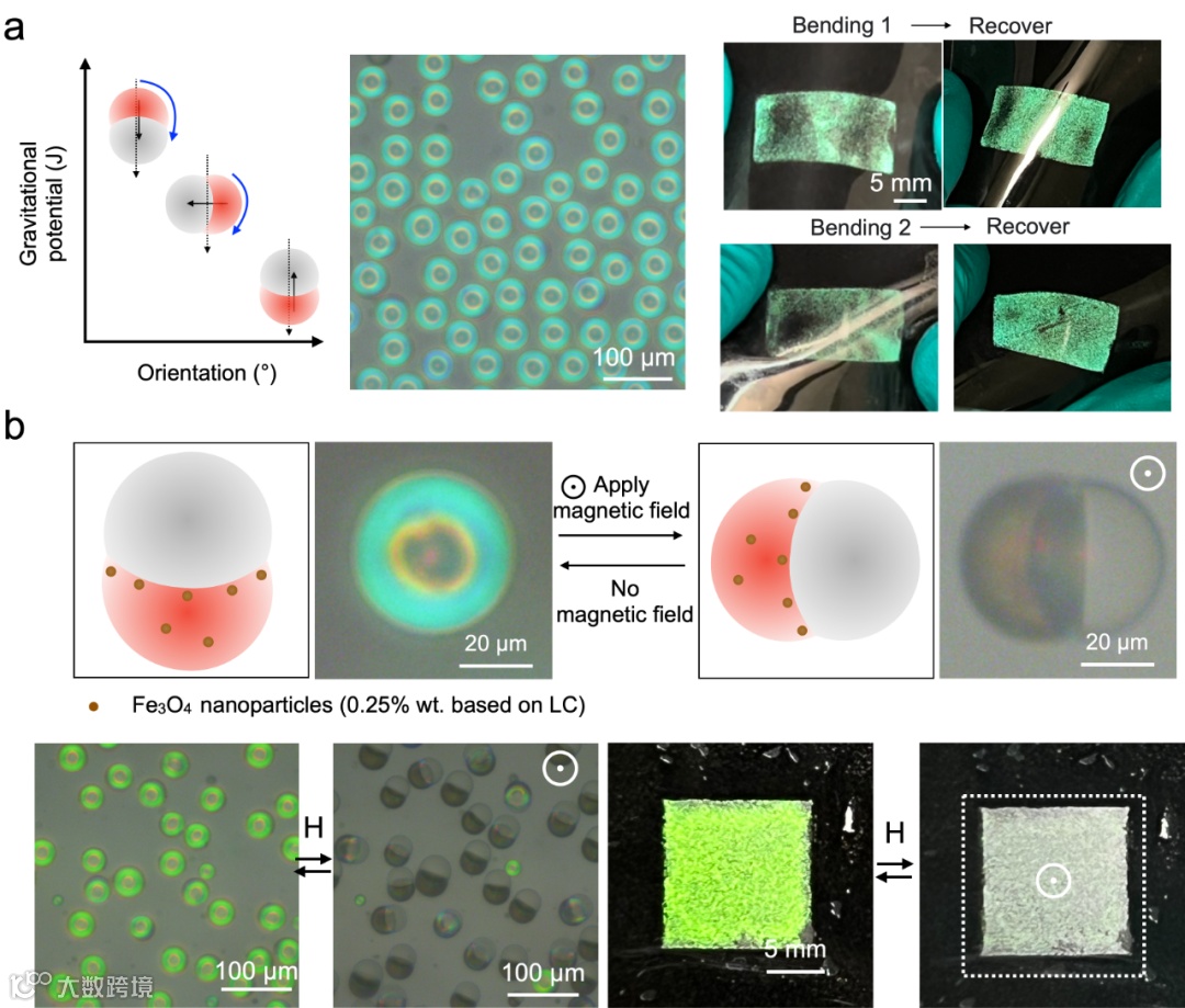 由于液晶相和硅油相的密度不同,在重力作用下,液滴的液晶相转至下方而硅油相转至上方(图2a)。当液滴分散于两片塑料薄膜之间制备柔性颜色显示屏并且被弯折时,颜色会短暂消失。但在重力作用下原来显示的颜色几秒后又会复原。因此,研究者进一步将磁性纳米粒子引入到微液滴的液晶相,利用磁场来克服重力的影响,从而控制液滴的取向。 这样显示屏上的结构色可以任意切换(图2b)。