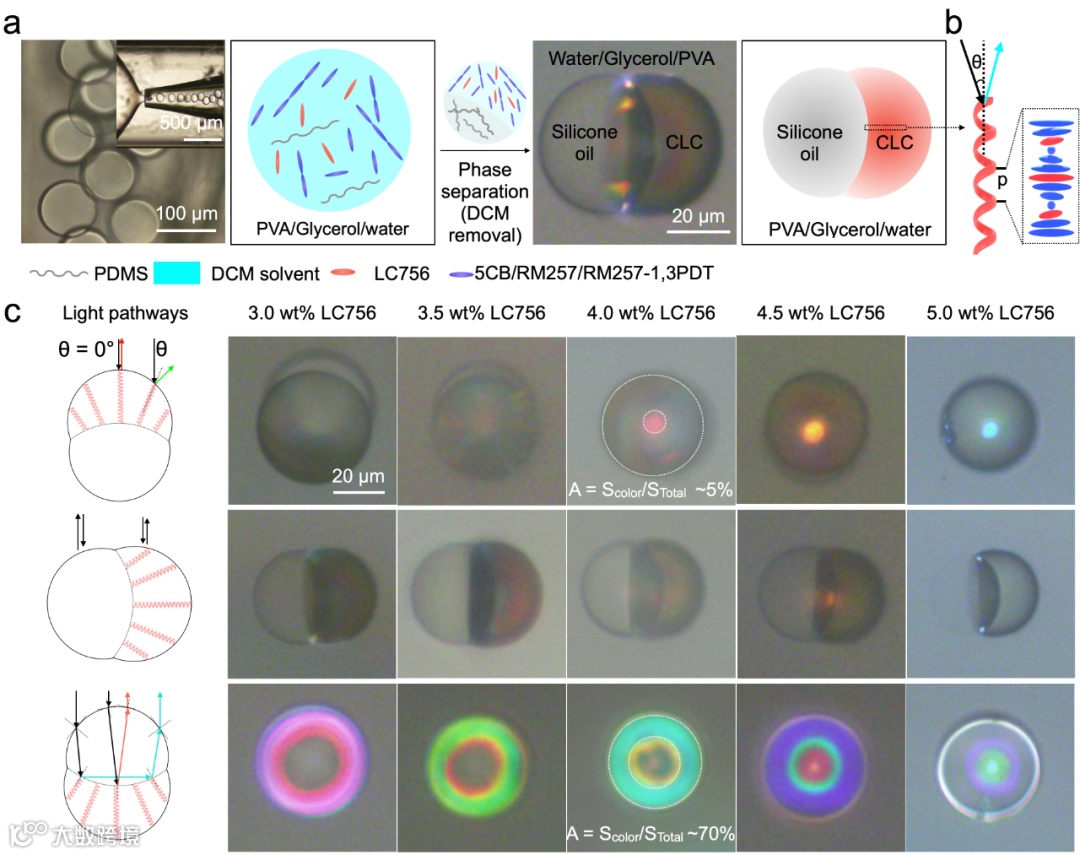 研究者首先利用氯仿作为共溶剂将液晶组分和硅油组分溶解在氯仿中,并利用微流控装置制备成大小均一的液滴(图1a)。随后,液滴被分散在聚乙烯醇(PVA)水溶液中并利用加热的方式将氯仿在通风橱中挥发,导致液滴中的液晶组分和硅油组分相分离形成双面液滴。由于溶液中的聚乙烯醇促进液晶组分的表面取向,同时液晶组分中的手性单体促进有序手性液晶相的形成,从而展示出结构色(图1b)。由于微液滴的双面结构,当从不同方向观察液滴时,白光从不同的界面反射而产生不同的光学效果。当光照向硅油一侧时,由于反射界面液晶的特殊排列以及半球状硅油的光学效应,反射光斑呈现出一个条带状。与直接被液晶微液滴面反射相比,这种情况下反射光的面积提高至约14倍。通过调控液晶组分中手性分子的浓度,结构色可以调控呈现在红色至紫色之间(图1c)。