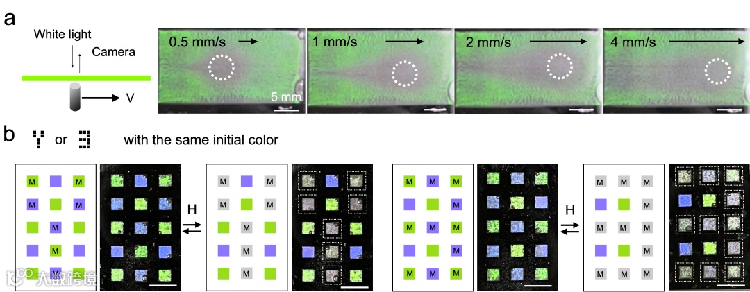 此外,由于液滴的转向和恢复需要一定的时间,磁场响应的微液滴悬液也可用于制备探测显示器以此检测磁性物质的速度(图3a)。当磁性物质的移动速度比液滴的恢复速度要慢时,探测显示器显示的图案与磁性物质的形状比较类似;当磁性物质的移动速度过快时,显示器则显示“拖尾”。因此,根据图案的形状, 可以推测磁性物质的移动速度。最后,研究者将磁场响应性和非磁场响应性的微液滴悬液混合在一起,制备成具有多个像素点的显示器(图3b)。通过预先编码每个像素点的颜色和响应性,处于相同初始颜色状态的显示器可以在磁场下显示截然不同的像素码信息。