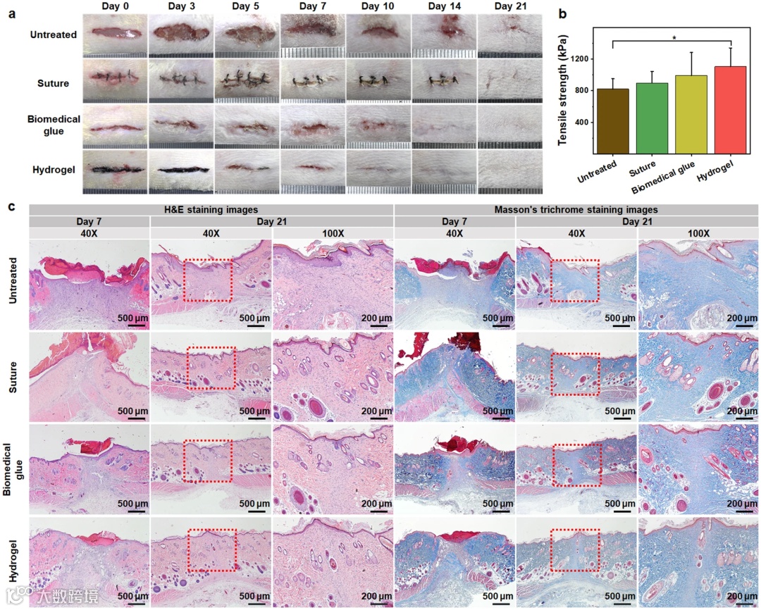 图8. (a) 不同时间点大鼠皮肤切口的愈合情况;(b)愈合21天后皮肤组织的拉伸强度;(c)愈合不同时间的大鼠皮肤组织的H&E和马松染色结果。