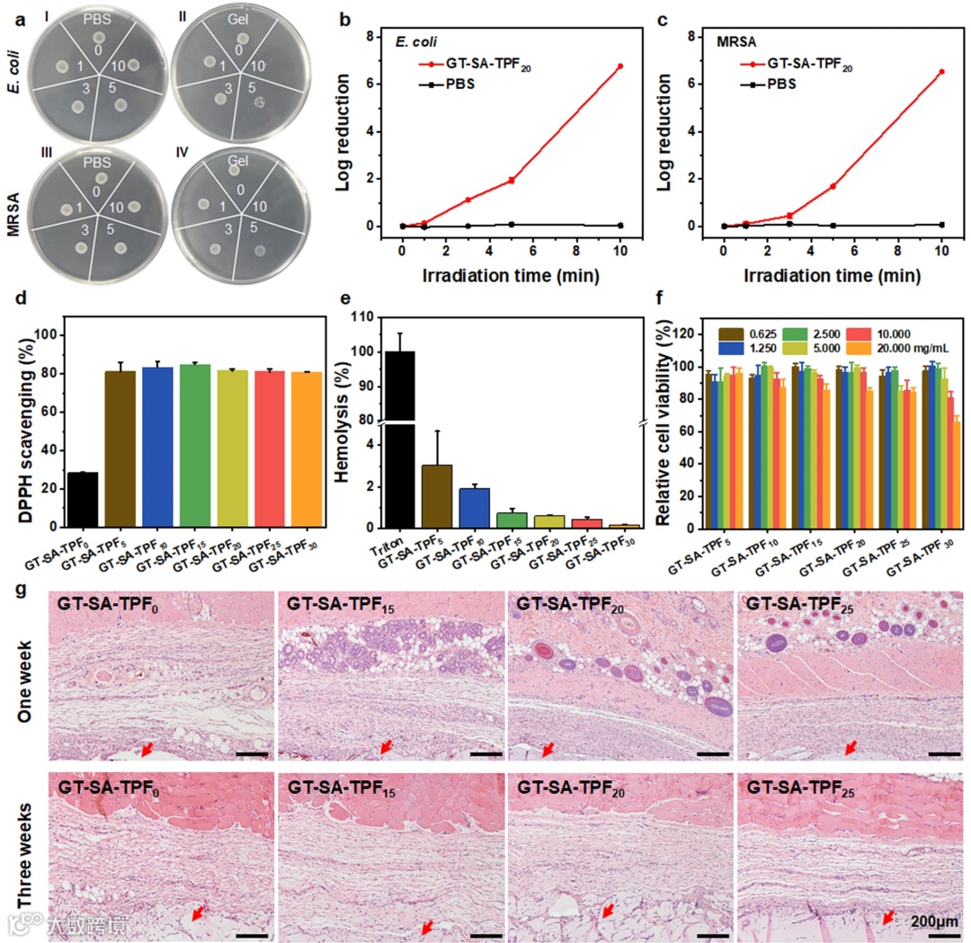 抗菌特性和生物相容性对组织的修复至关重要。由于PA与Fe³⁺的配位作用,该凝胶表现出良好的光热抗菌特性(图4a)。体外细胞和血液相容性测试表明该凝胶具有良好的细胞相容性和血液相容性(图4e和f)。皮下埋植实验结果表明该凝胶具有良好的长期生物相容性(图4g)。