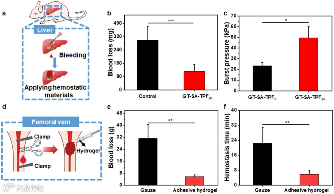 图7. (a)小鼠肝脏出血模型的构建;(b)不同条件下小鼠肝脏的出血量;(c)凝胶材料的爆破压;(d)兔子股静脉出血模型的构建;不同条件下兔子股静脉的(e)出血量和(f)止血时间。