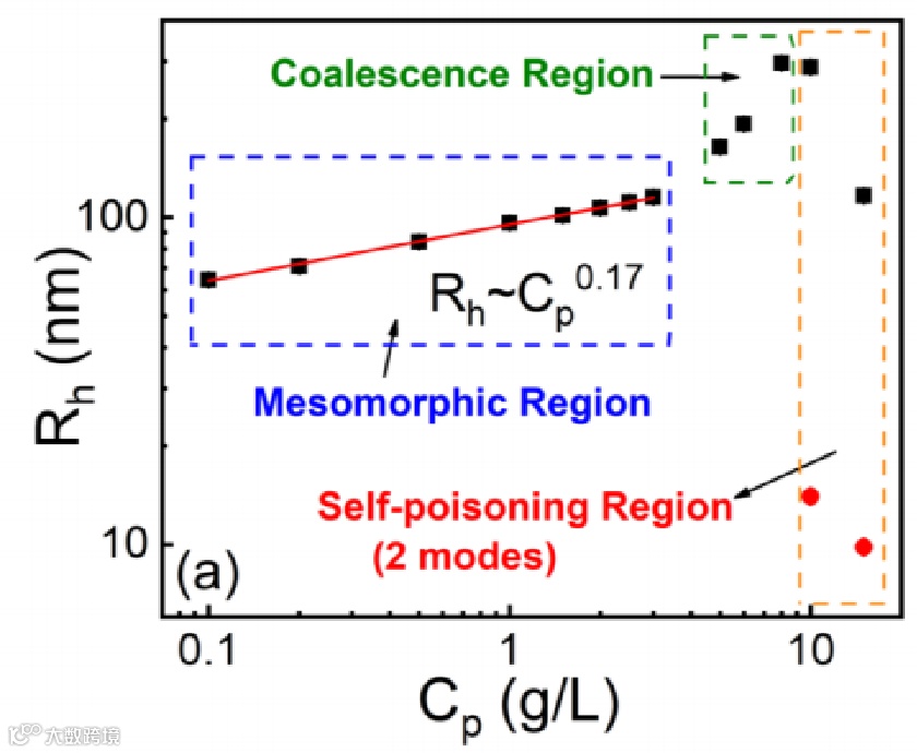 在聚阳离子和带负电的有机盐小分子的复合体系中通过调节离子强度会产生丰富的相行为,包括低离子强度下的液-液相分离和高离子强度下的高分子单链溶液。介于这两相之间在中等离子强度下会出现纳米级单分散球形聚集体所组成的介观“乳液”态,根据理论计算其物理本质是由链间偶极-偶极相互作用力所产生的,并且球形聚集体的尺寸R与高分子浓度Cp呈现1/6的幂律标度关系(R~Cp^1/6),并已得到实验验证(图1)。而当高分子浓度高于一个临界值时(高分子与有机盐的摩尔电荷量比值固定),聚集体会大量自我解体(self-poisoning)成单链,这是由于有机盐小分子除了与聚电解质复合形成偶极外,还有大量过剩的有机盐充当了小分子盐的角色,从而自我屏蔽偶极-偶极相互作用,使聚集体大量解体(图1)。