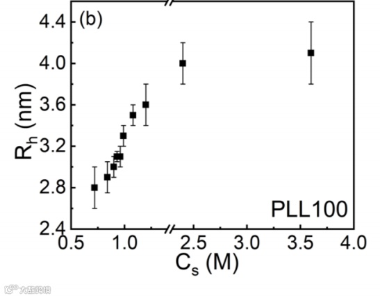 此外,他们在稀溶液中发现随着离子强度的增加,高分子单链的尺寸会增加,出现“globule-to-coil”的构象转变(图2),而传统的聚电解质溶液随离子强度的增加尺寸会变小,这种“反聚电解质效应(anti-polyelectrolyte effect)”是由链内的偶极-偶极相互作用所引起的,是传统两性聚电解质的典型特征。