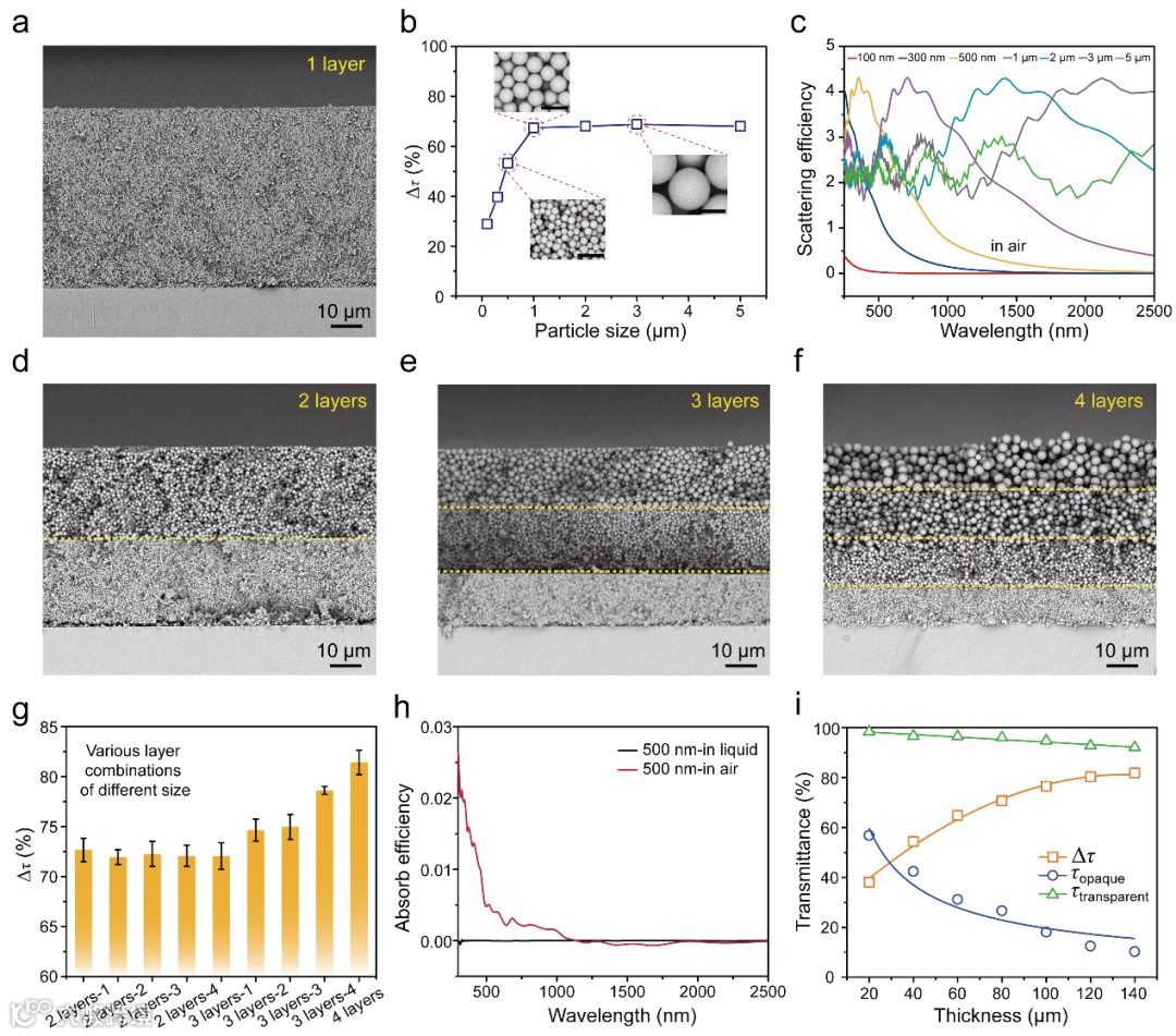 近日,电子科技大学邓旭教授团队开发了一种自适应热管理设备(self-adaptive thermal management device,STMD)。STMD由二氧化硅颗粒涂层以及与二氧化硅折射率匹配的低沸点液体密封构成。利用不同季节的室内外温差,驱使液体与涂层的分离和融合从而实现温度管理。例如;夏天室外温度较高时,器件中朝外的涂层中液体挥发与涂层分离,干燥的涂层对太阳光谱的透射率非常低(<11%),加之二氧化硅涂层本身有很强的辐射能力,因此在夏季高温时可实现被动降温;相反,冬季由于室内温度较高,靠近室内内侧的液体则挥发后在涂层侧冷凝与涂层结合,由于涂层和液体折射率高度匹配,可实现较高的太阳光谱透射(>94%),并且利用太阳能加热室内。因此,这种温差自动调节机制,使STMD能够在夏季超过900 W m−2的太阳辐射下,相对于环境温度降低5 ℃;在冬季平均太阳辐射400 W m−2下,使温度相对于环境温度升高10 °C。此策略为构建智能光控制设备,以及热管理类建筑材料提供了一种思路。
