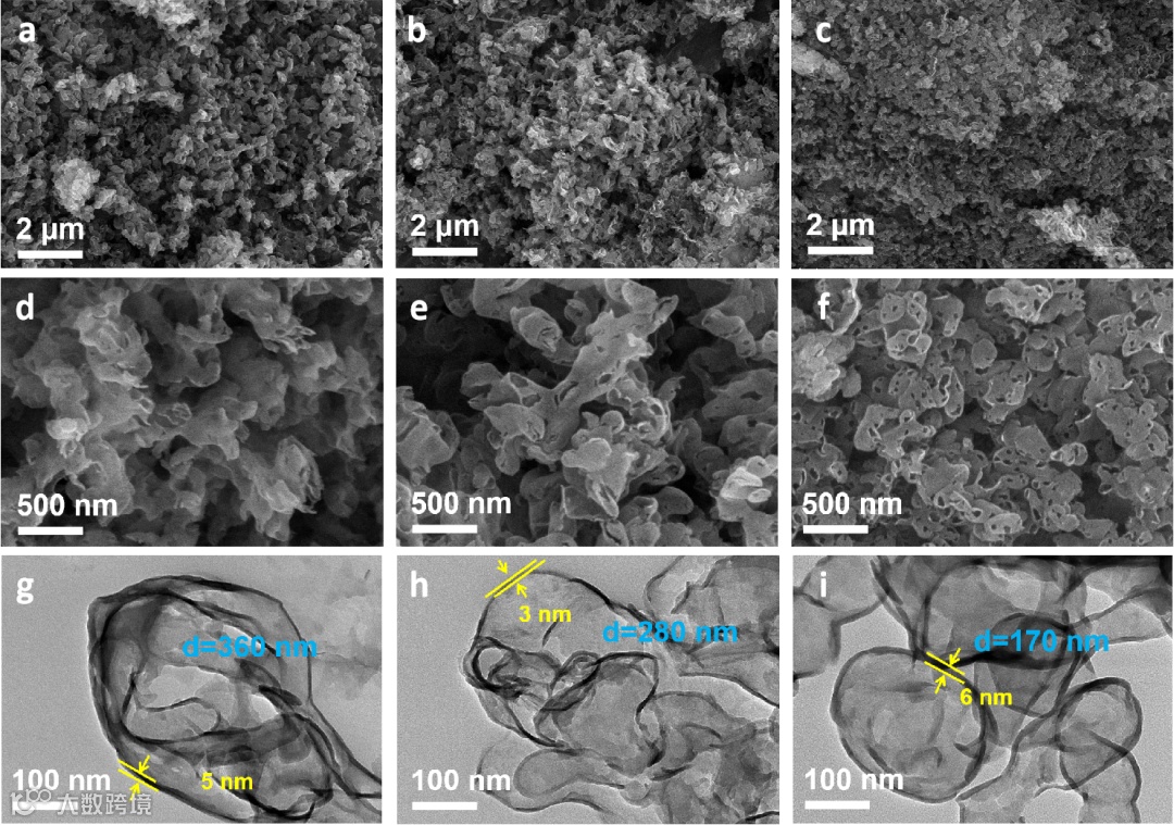 聚合物氮化碳囊泡结构通过SEM、TEM等手段得到了表征。调节前驱体的质量比可以在气体影响下产生不同尺寸的囊泡结构。随着囊泡直径大小的变化,分散在表面的孔隙数量也相应变化。