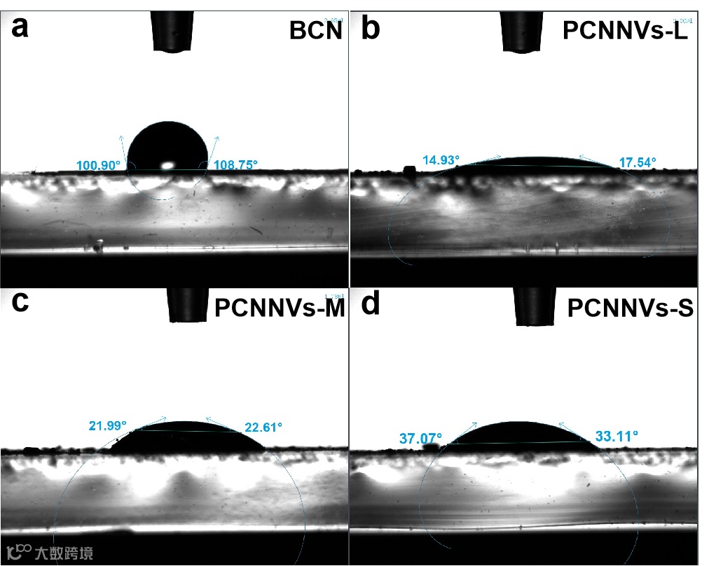 通过测量水滴的接触角,来确定样品的表面特性,大尺寸聚合物氮化碳囊泡具有较低的接触角,意味着更亲水的表面,更容易实现与H2O分子的接触发生析氢反应。