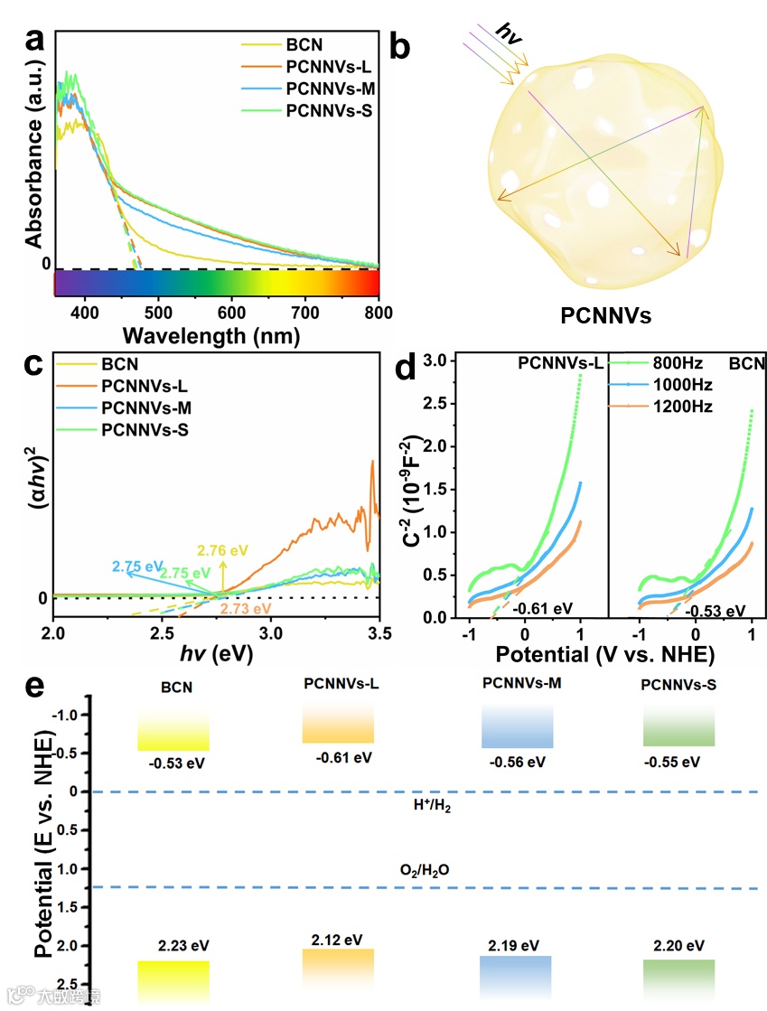 测量UV-vis确定催化剂的光学性能,提供了在光照射下囊泡结构聚合物氮化碳的光散射模型,该结构有效地提高了可见光的吸收,这归因于接触面积的增加,传播路径的强度和可见光的散射。结合带隙和CB的位置,计算VB,得到制备的光催化剂的带结构。