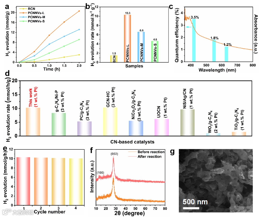 通过无模板自组装合成的PCNNVs具有丰富的结构缺陷的多孔结构,使其能够吸附质子,大大提高了光催化制氢的活性。此外,与BCN相比,PCNNVs具有更高的比表面积,增加了活性位点,加快了光催化制氢反应的前进步伐。此外,PCNNVs的超薄壳结构为光诱导电子提供了可利用的通道,并为电子从体积向表面迁移提供了更短的扩散通道。PCNNVs-L具有最小的接触角和最好的亲水性,这加速了电子传输并导致光诱导电荷载体的快速分离。