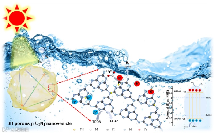 利用半导体光催化水解制氢被认为是一种有前景的太阳能转化手段。近年来,石墨相聚合物氮化碳(g-C3N4)材料由于其可见光反应、无毒、高化学稳定性和低成本,以及其丰富的地球碳和氮元素,已成为光催化材料的研究热点之一,被认为是一种极有前途的产氢的光催化剂。然而,因g-C3N4的低表面积,光利用率不足,电子传输路径长,以及光生载体的快速重组,其光催化活性受到限制。类囊泡状g-C3N4被用来优化纯相g-C3N4的以上几个缺点,但其目前的合成方法复杂且对环境不友好,仍需进一步优化。