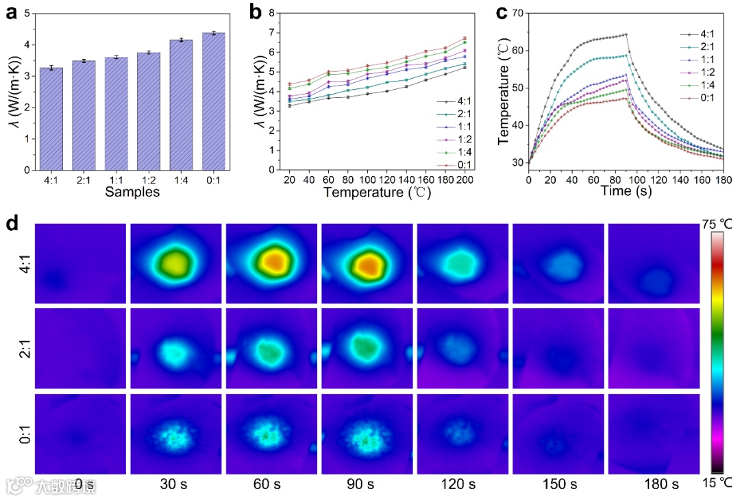 Figure 6. Thermal conductivity of (Fe3O4/PI)–Ti3C2Tx–(Fe3O4/PI) composite films: λ values of (Fe3O4/PI)–Ti3C2Tx–(Fe3O4/PI) composite films which are a) based on different mass ratios of PMMA/Ti3C2Tx and b) under different temperatures; c) the surface temperatures and d) the corresponding infrared thermal images of the (Fe3O4/PI)–Ti3C2Tx–(Fe3O4/PI) composite films.