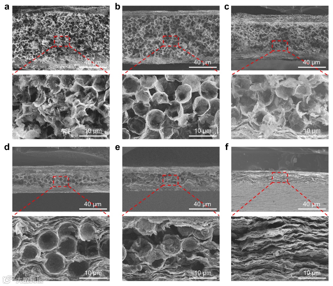 Figure 4. Morphology of (Fe3O4/PI)–Ti3C2Tx–(Fe3O4/PI) composite films based on different mass ratios of PMMA/Ti3C2Tx: the cross-sectional SEM images of (Fe3O4/PI)–Ti3C2Tx–(Fe3O4/PI) composite films prepared with the mass ratios of PMMA/Ti3C2Tx of a) 4:1, b) 2:1, c) 1:1, d) 1:2, e) 1:4, and f) 0:1.