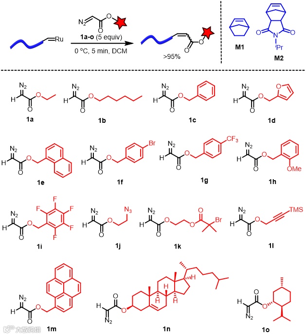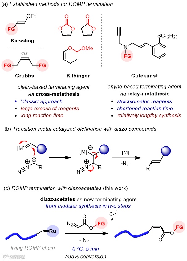 在这些策略中,利用功能化封端剂直接淬灭ROMP增长链是得到末端功能化高分子最直接的方式。传统的封端方式是基于乙烯基醚、烯基碳酸酯、烯基内脂或者顺式烯烃的交叉烯烃复分解(图1a),但是这种封端方式存在着封端剂用量高、合成复杂、反应时间长等问题。同时,直接引入缺电子烯烃末端,如Michael受体末端,是具有挑战性的。
