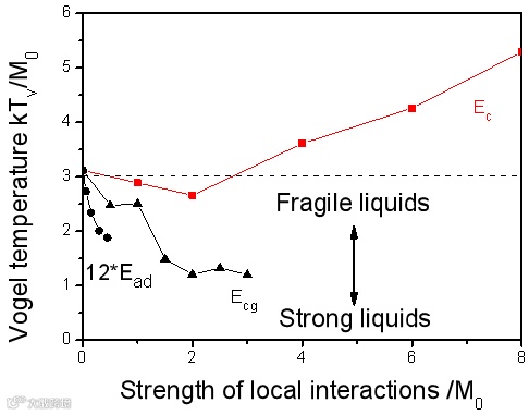 图1 反映聚合物脆性和刚性的Vogel温度随各种相互作用强度变化的分子模拟结果。水平虚线表示熵效应所导致的对线性黏弹性本征偏离,Ead是分子间内聚能动理学位垒,Ecg是分子内构象转变动理学位垒,这两项动理学相互作用参数皆抑制偏离程度,对过冷液体刚性有利,Ec是分子内构象转变热力学非柔顺性参数,对过冷液体脆性有利。
