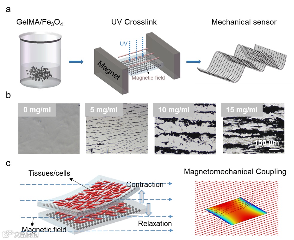 近期,西安交通大学生命学院张晓慧教授课题组开发了一种基于甲基丙烯酸明胶(GelMA)/四氧化三铁(Fe3O4)磁性水凝胶薄膜的超柔性的、优异生物相容性的磁基应变传感原型器件。构建的磁性水凝胶薄膜表现出超软机械性能(杨氏模量1.2 kPa)、强磁性(12.74 emu/g)、优异的生物相容性以及在盐溶液中的长期稳定性。受益于这些材料特性,应变传感器可实现低至50 μm应变的检测能力。在磷酸盐缓冲溶液中,传感器仍可保持长期的抗离子干扰能力。此外,通过建立模拟传感过程的磁场模型,获得磁场检测的最佳空间位置以及传感器相对磁导率与检测灵敏度之间的关系。进一步通过将传感器与体外心肌模型结合,验证了其良好的生物相容性以及对微弱生物自主活动的低干扰。最后,设计了一个可对心脏收缩力进行长期监测的实时的、高通量、无源无线的实验平台。基于此,实现对药物刺激和培养时间对心肌细胞收缩能力影响的实时监测。本研究构建的磁基应变传感器为实现无线无源的生物力学监测提供了一个通用平台,提出了一种在植入式设备中通过磁场传递信息的新思路。