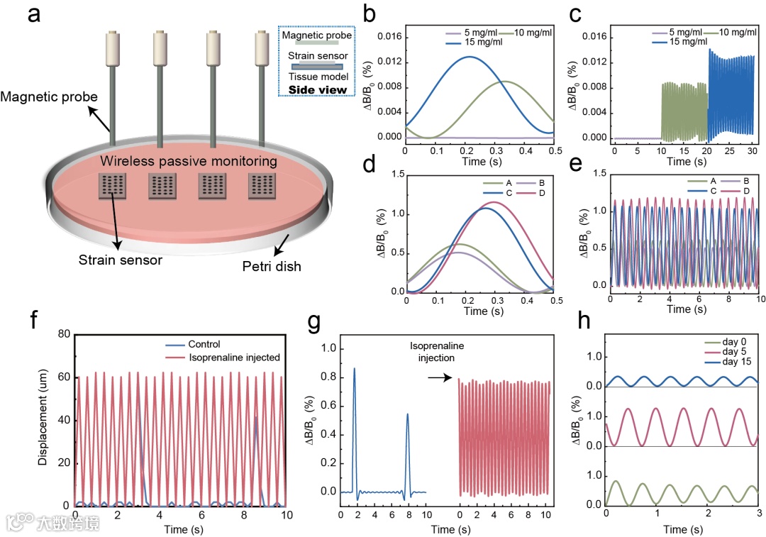 图3 (a)基于磁基应变传感器的无线无源生物力学监测平台;(b)(c)不同磁颗粒浓度传感器监测的心肌搏动信号;(d)(e)不同心肌细胞浓度(A, B: 1×106 cells/cm2; C, D: 2×106 cells/cm2)产生的同步收缩信号;(f)(g)心肌细胞的药物反应;(h)平台对心肌细胞的长期监测结果