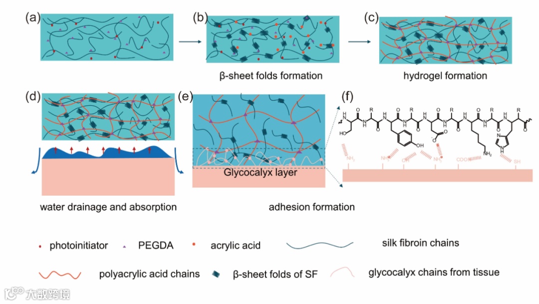 水凝胶粘合剂在止血、伤口愈合、组织修复等生物医学领域有广泛的应用。水凝胶粘合剂和组织之间的有效粘附对伤口封闭及其愈合过程有重要影响,然而伤口表面血液或组织液的存在会降低有效粘附面积,同时也会在伤口表面形成水化层阻碍粘附界面的形成从而导致粘附力下降甚至脱落。目前商用的氰基丙烯酸酯基粘合剂虽然可以在水存在的情况下发生聚合反应并形成粘附,但是其聚合过程会放热,同时它们固化后会变硬,限制了其应用范围。基于琥珀酰亚胺(NHS)封端的多臂聚乙二醇预聚物和三赖氨酸胺体系的ReSure®粘合剂可以在30秒内粘附于组织表面,但是ReSure®粘合剂多用于密封没有主动渗漏的伤口,而且它的粘附时间不够理想。高强柔韧稳定的湿面粘合剂将会在生物医学等领域有重要应用。