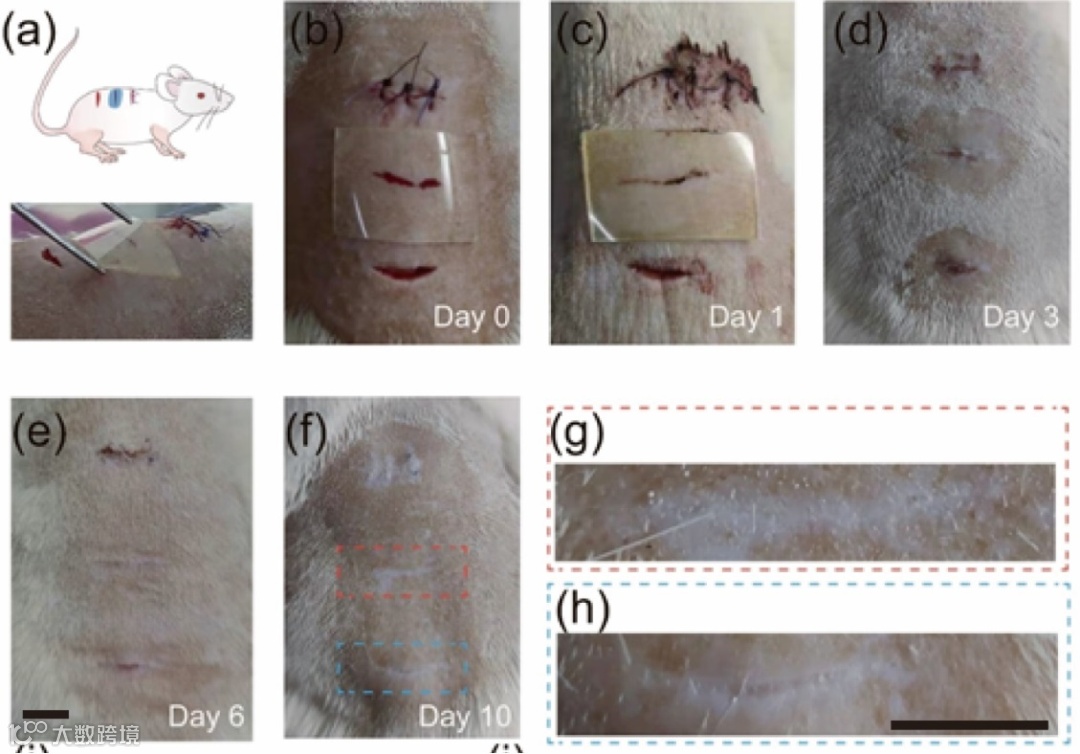 图3 (a)和(b)PSA可以快速粘附于大鼠伤口表面,在(c)第一天、(d)第三天(e)第六天、(f)第十天的皮肤愈合图片、(g)和(f)分别是实验组和对照组放大图。