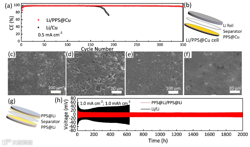 图2.半电池和对称电池的表面形貌和电化学性能。(a)电流密度为0.5 mA cm-2时Li/PPS@Cu和Li/Cu电池的CEs,插图为Li/PPS@Cu半电池结构图示。(b)Li/PPS@Cu电池示意图。(c)裸露铜箔的SEM图像。(e)PPS@Cu箔的SEM图像。(d)和(f)分别是(c)和(e)的放大扫描电子显微镜图像。(g)PPS@Li/PPS@Li电池示意图。(h)PPS@Li/PPS@Li和Li/Li电池在1.0 mA cm-2时的循环性能。