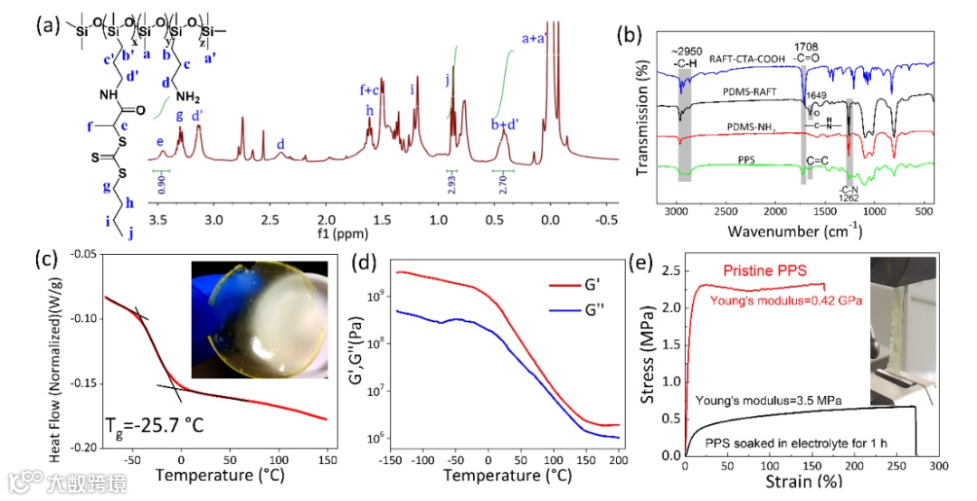 图1. 所制备聚合物的表征。(a)PDMS-RAFT的1H核磁共振波谱。(b)RAFT-CTA-COOH、PDMS-RAFT、PDMS-NH2和PPS的FT-IR光谱。(c) PPS聚合物的DSC曲线和PPS膜的照片。(d) PPS聚合物的流变性分析。(e)PPS在电解液(1M of LiPF6 in EC/EMC)中浸泡1h前后的拉伸试验。插图为拉伸后的PPS薄膜的照片。