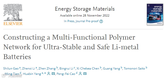 原文链接:Constructing a Multi-Functional Polymer Network for Ultra-Stable and Safe Li-metal Batteries, Energy Storage Materials, 2022, DOI: 10.1016/j.ensm.2022.11.049,