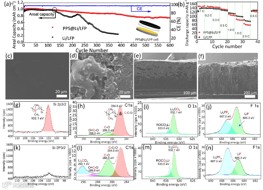 图3.电池的电化学性能和锂电极的表面分析。(a)PPS@Li/LFP和Li/LFP电池在电流密度为1C时的循环性能。(b)PPS@Li/LFP和Li/PPS电池的倍率性能测试。(c)和(d)分别是以LFP为正极的PPS@Li和裸Li电极在50次循环后的SEM图像。(e)和(f)分别是以LFP为正极的PPS@Li和裸Li电极在50次循环后的横截面SEM图像。(g-n) PPS@Li和裸Li电极的XPS光谱:(g) PPS@Li电极的Si 2p3/2, (h) C 1s, (i) O 1s 和 (j) F 1s光谱;(k) 裸Li电极的Si 2p3/2, (l) C 1s, (m) O 1s 和 (n) F 1s光谱。