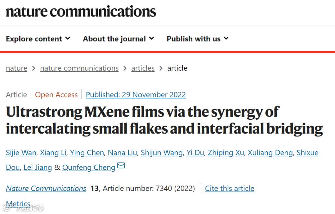 2022年11月29日,《Nature Communications》在线刊登了北京航空航天大学化学学院程群峰教授课题组的最新研究成果“小片填充和界面交联协同致密化的超强MXene薄膜”(英译:Ultrastrong MXene films via the synergy of intercalating small flakes and interfacial bridging),北京航空航天大学化学学院万思杰副教授、李响、北大口腔医院第一门诊部陈英博士、北京航空航天大学物理学院刘娜娜博士为第一作者,程群峰教授为通讯作者,北京航空航天大学化学学院为第一完成单位。