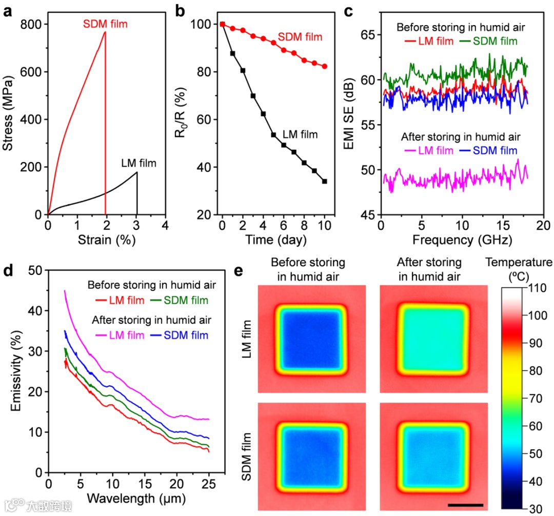 图4. LM和SDM薄膜的性能:(a)LM和SDM薄膜的拉伸应力-应变曲线;(b)LM和SDM薄膜在潮湿空气中储存10天过程中的电导保持率;LM和SDM薄膜在潮湿空气中储存10天前后的(c)电磁屏蔽系数,(d)红外发射率以及(e)在100度加热台上的红外照片