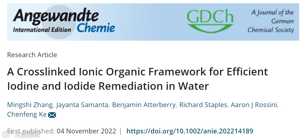 近年来,美国达特茅斯学院的柯晨峰(Chenfeng Ke)课题组开发了一系列氢键交联有机骨架材料(HCOF)。它们同时拥有刚性的氢键网络和柔性共价交联结构。框架上的三嗪官能团可有效与客体碘(I2)分子形成卤键,取代氢键来使HCOF材料框架进一步“溶胀”,进而有效吸附水中的碘单质(I2)。