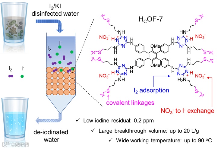 碘(I2)作为广谱抗菌试剂,被广泛用于野外和外太空中的饮用水消毒。在实际应用中,需要将使用I-增加I2的溶解度。例如,国际空间站上的便携式饮水机(PWD)系统使用总浓度约为5 ppm的碘(I2)和碘化物(KI)消毒饮用水。为降低其对人体的健康危害,这些残留的碘和碘化物需要在消毒后去除。目前,国际空间站中使用活性炭/离子交换树脂混合柱去除残余碘。该混合物碘吸附量较低,且不能在高温下(50-90°C)中使用。因此,国际空间站目前需要首先对循环系统中的热水降温,再去除其中的碘残余。如果宇航员需要饮用热水,则需重新加热。因此,现实条件下需要可以在较大温度范围有效去除水中低浓度残余碘的材料。虽然此前已经有包括金属有机骨架(MOFs)、共价有机骨架(COFs)、多孔有机聚合物(POPs)、氢键有机框架(HOFs)在内的一系列多孔材料被开发用于碘吸附。然而,在大多数情况下,这些材料被应用于碘(I2)蒸汽的吸附,少数在水溶液中的相关研究也主要聚焦于常温下对高浓度碘单质(I2)的吸收。能在较大温度范围内(23-90°C)对水中低浓度的碘(I2)和碘离子(I-)协同吸附的有机多孔材料还未被报道。