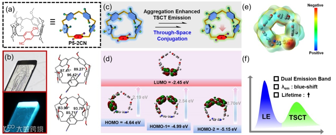 图2.(a)P5-2CN的化学结构;(b)晶体的光学显微镜图像(红框),P5-2CN的计算结构(右上)和单晶结构(右下);(c)P5-2CN的发光机制;(d)P5-2CN的分子轨道能级和电子云密度分布图;(e)P5-2CN的表面静电势和(f)P5-2CN的分子内空间共轭发光特性。