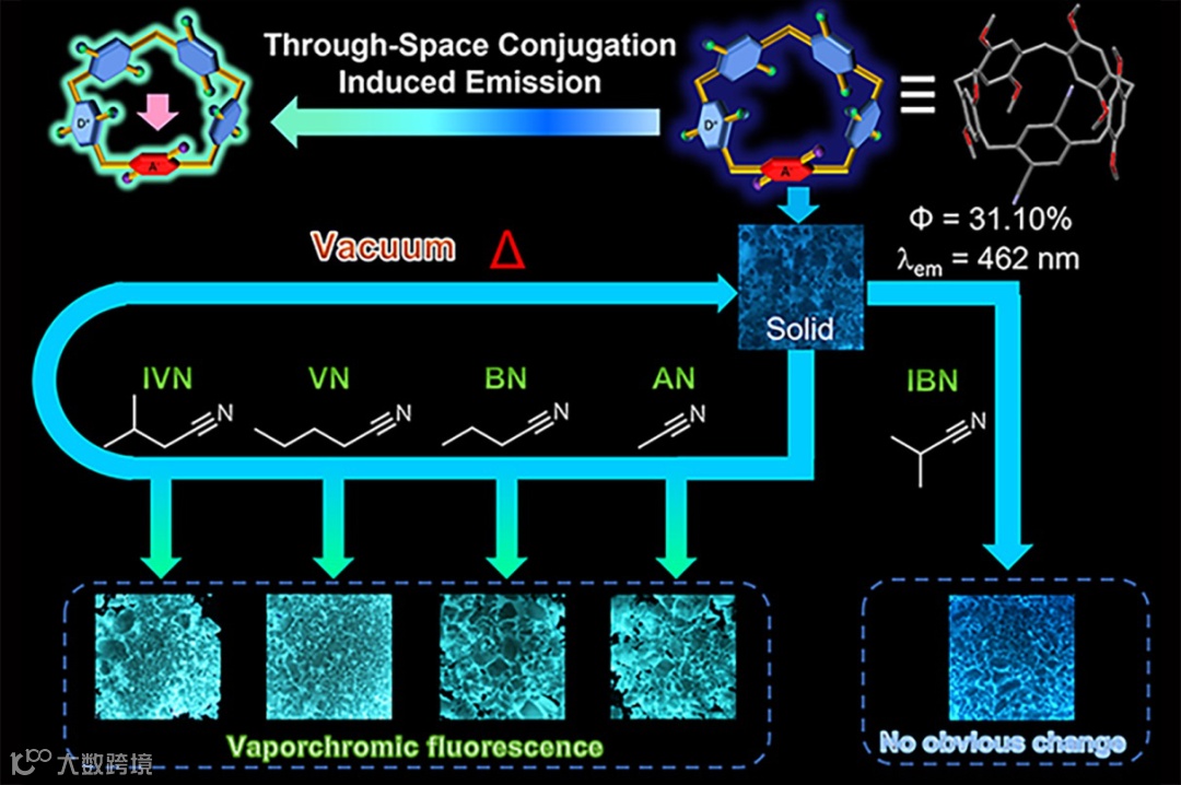 有机荧光团在光通信、发光二极管、荧光防伪等前沿领域有着广阔的应用前景,合成新型有机荧光团并对发光机理进行深入探究是目前发光材料的研究热点。近年来,随着超分子大环的不断发展,许多大环分子被用于设计和构建新型的发光材料。其中,柱芳烃具有对称的刚性柱状结构、特殊的富电子空腔和优异的主客体性质,因此被广泛用在发光材料的设计上。目前基于柱芳烃的有机荧光团的设计思路主要有三种,一是通过多步有机合成策略将荧光团修饰到柱芳烃骨架上,二是将供受体组件作为修饰基团对柱芳烃进行后期功能化,此时柱芳烃骨架作为空间隔断,使供受体之间产生空间上的电荷转移而发光,三是利用柱芳烃的主客体络合性质,引入有机荧光团作为客体分子,通过超分子自组装聚合发光。一般来说,以上方法无论在制备还是再生上都耗时耗力。因此,开发供受体型的柱芳烃发光主体具有重要意义。