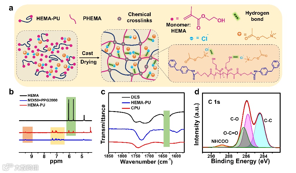 (1)采用DES(HEMS: ChCl)与HEMA封端的聚氨酯预聚体一步共聚法制备导电聚氨酯(图1)。DES作为一种透明液体导电填料,在体系中起到了双重作用:一是作为导电添加剂,二是通过共价键作为聚合物网络的一部分来增强力学性能。此外,DES与聚氨酯之间的共价键作用将提高所形成的导电聚氨酯的稳定性和相容性。这为导电聚氨酯的合成提供了一种新的途径。