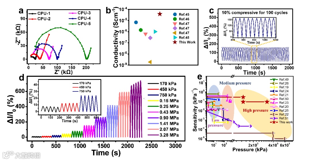 (3)新型导电聚氨酯基器件在压力传感方面具有较高的灵敏度和重复性。此外,该材料对外加压力的响应范围较宽(约0.17~3.28 MPa)(图5),是一种很有前途的智能材料,满足现代智能工业的需求。