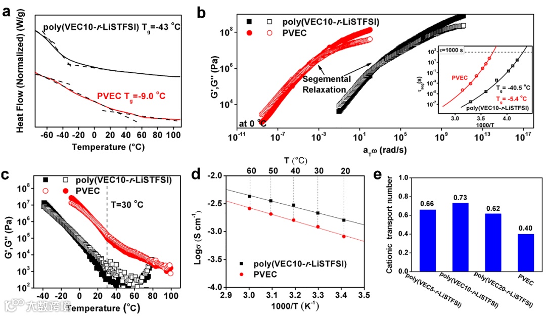 图1. (a)Poly(VEC10-r-LiSTFSI)和PVEC的DSC曲线。(b) poly(VEC10-r-LiSTFSI)和PVEC在0°C下的存储模量G’(固体)和损耗模量G”(空)的主曲线。插入:估计的节段弛豫时间相对于1000/T。(c) 在223 K至373 K之间剪切模量的储存和损失部分。(d) PVEC和poly(VEC10-r-LiSTFSI)在20至60 ℃温度下的Arrhenius图。(e)Poly(VEC-r-LiSTFSI)和PVEC的tLi+值。