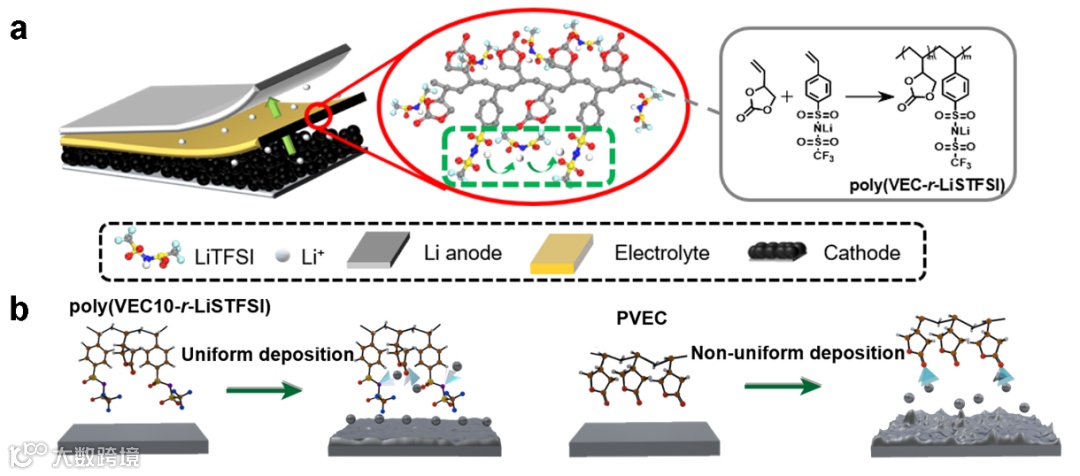 Scheme 1. 高阳离子迁移数的聚合物电解质的设计和制备说明。(a)合成。(b)Li+在Li阳极上的电化学沉积示意图。