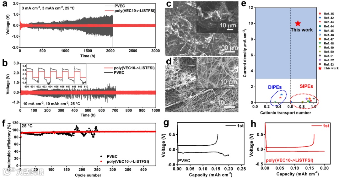 图2. Li/poly(VEC10-r-LiSTFSI)/Li和Li/PVEC/Li电池在(a) 3 mA cm-2和(b) 10 mA cm-2的电流密度下的循环表现。(c) PVEC和(d) poly(VEC10-r-LiSTFSI)的表面SEM电镜照片。(e)其他普通聚合物电解质的电流密度对比(f)不同聚合物电解质Li/Cu电池在0.2 mA cm-2的电流密度下的库仑效率。(g) PVEC和(h) poly(VEC10-r-LiSTFSI)的Li/Cu电池的电压-容量曲线。