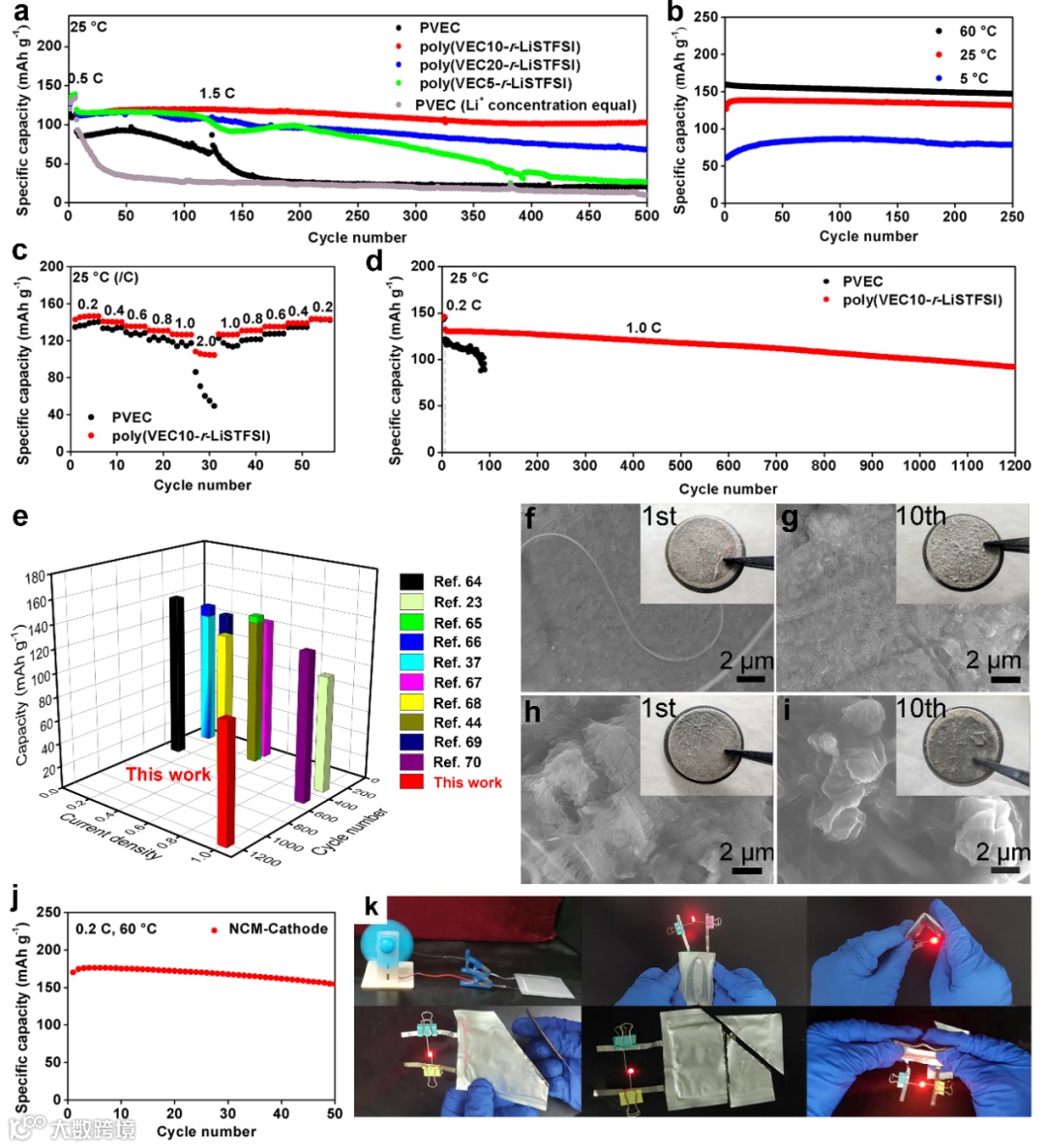 图4. 不同聚合物电解质对LMBs电化学性能的影响。(a) Li/LFP电池在1.5C时的循环性能比较。(b) poly(VEC10-r-LiSTFSI)在60℃、25℃和5℃时的循环性能。(c)倍率性能对比。(d) Li/LFP电池在1C时的循环性能。(e)与文献中其他聚合物电解质的循环寿命比较。Li/poly(VEC10-r-LiSTFSI)/LFP电池在(f)第1和(g)第10次循环后的锂表面的SEM图。(h)第1和(i)第10循环后Li/PVEC/LFP电池锂表面的SEM图像。(j) Li/poly(VEC10-r-LiSTFSI)/NCM电池的循环性能。(k)组装的软包电池的安全性和实用性的数字照片。