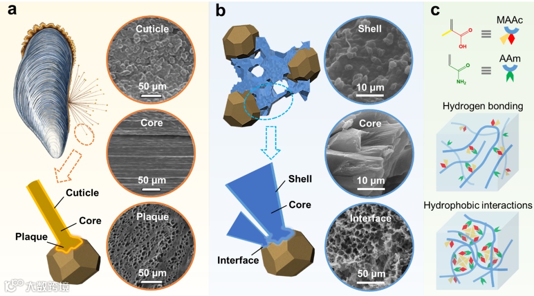 利用水凝胶替代水泥类材料作为岩土稳定剂具有良好的可持续性与环境价值。然而,水凝胶遇水吸胀机械性能大幅下降,故而其应用场景收到很大局限。受到贝类丝足启发,本研究开发了一种具有良好水下稳定性的仿生水凝胶岩土稳定剂,在土壤中可自发形成类似贝类丝足的异质结构。该结构具有良好的机械强度和优异的抗溶胀性能,可在各种自然环境中保持岩土的稳定性。此外,该材料展现出的透水、保水性对生态系统的可持续发展也具有促进作用。