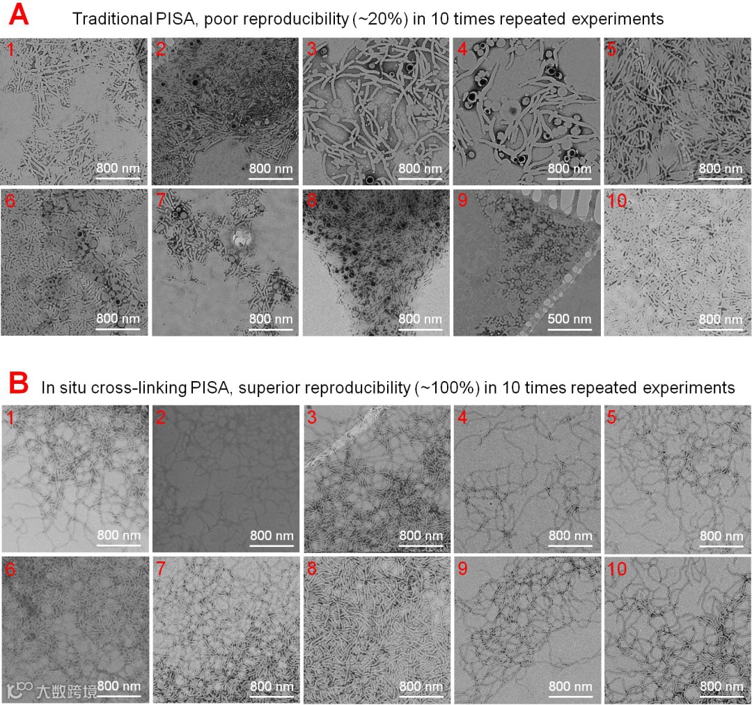 图2. (A) 以传统PISA所得形貌相图为参考进行10次重复实验制备聚合物纳米线所得产物的TEM照片,(B) 以原位交联聚合诱导自组装所得形貌相图为参考进行10次重复实验制备聚合物纳米线所得产物的TEM照片。