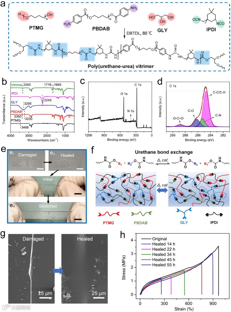 首先,通过聚四氢呋喃(PTMG)、聚1,4-丁二醇双(4-氨基苯甲酸酯)(PBDAB)、异佛尔酮二异氰酸酯(IPDI)和甘油(GLY)之间的缩聚反应合成了一系列新型的Vitrimer弹性体(图2)。由于共价网络的强健性和高温下氨酯键的动态交换能力,它们不仅表现出优异的力学性能(>968%,3.6 MPa)和滞后可忽略的机械回弹性,而且具有93%的自修复效率。其次,利用光子带隙和动态共价网络的协同作用,在Vitrimer弹性体中嵌入三维PC结构,制备了光子弹性体(PE)(图3)。它不仅具有较强的机械强度(4.7 MPa)和明亮的结构颜色,而且具有良好的机械性能和光学功能的自修复性(图4)。