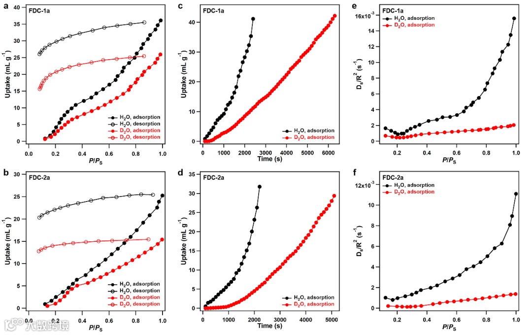 图3:(a) FDC-1a和(b) FDC-2a对H2O和D2O的吸-脱附曲线;(c) FDC-1a和(d) FDC-2a对H2O和D2O的时间依赖吸附曲线;(e) FDC-1a和(f) FDC-2a对H2O和D2O的扩散速率曲线。