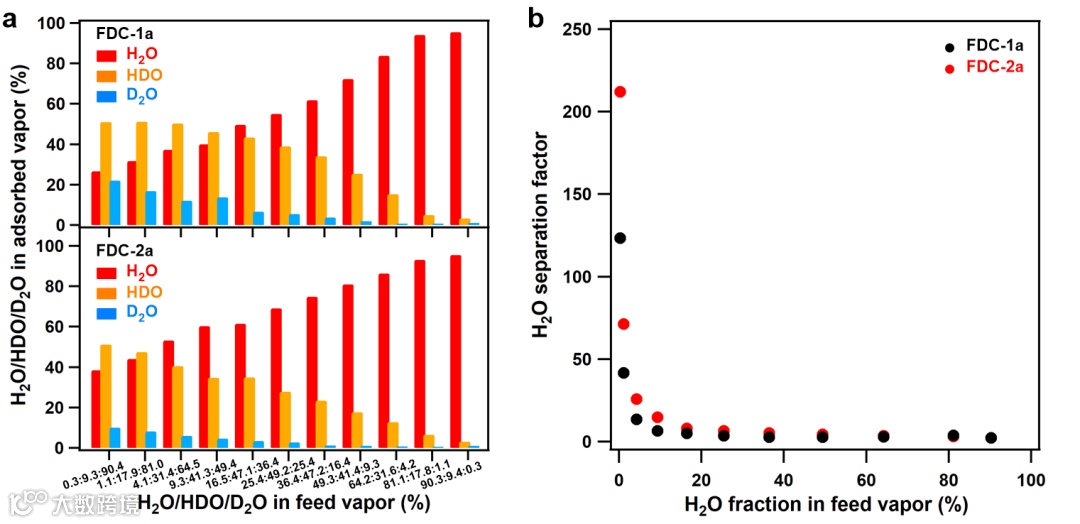 图4:(a) FDC-1a和FDC-2a水同位素体分离柱状图(即吸附相中水同位素体吸附比例随原料蒸气中相应含量变化的曲线);(b) FDC-1a和FDC-2a的吸附相中H2O分离因子随原料蒸气中H2O含量变化的曲线。