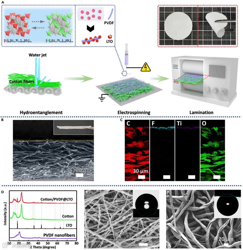 近日,刘巍教授团队开发一种具有定向水渗透功能的复合不对称非织造材料(composite asymmetric nonwoven, CAN),CAN由一层含有锂离子筛(钛酸锂,Li4T5O12)颗粒的疏水(聚偏氟乙烯,PVDF)纤维层和一层亲水(棉,cotton)纤维层组成(图1)。先通过水刺非织造加工工艺制备棉纤维层(亲水层),然后在其表面通过静电纺丝制备含锂离子筛的PVDF纳米纤维层(疏水层),最后通过热轧实现亲水层与疏水层的复合(图2)。这项工作无需任何外部驱动力的情况下实现了锂离子的提取,有望为海水/盐湖提锂节省能源成本带来希望。