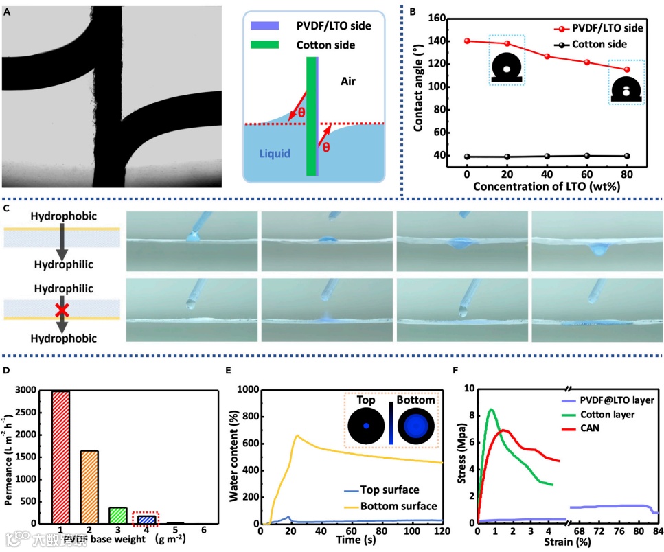 CAN的非对称亲水/疏水结构与定向水渗透的特性。CAN在两面展示了完全不同的润湿性(图3),亲水面的接触角为~35°,而疏水面的接触角为~115°,这种非对称润湿结构导致CAN两面表现出不同的毛细效应。利用亲水/疏水纤维本征形貌与润湿性差异构建润湿梯度,当液体与疏水面接触时,在重力与材料自身的毛细管压力差的作用下,液体通过疏水提锂层内部通孔以及亲水纤维导流完成自主渗透;而当液体接触亲水面时,液体迅速扩散到整个表面,无法形成足够的高度克服疏水面毛细管压力,因而无法穿透CAN。因此,这种定向水渗透特性可以驱使含Li+水溶液在无任何外力的条件下穿透CAN。